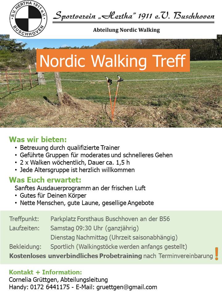 Nordic Walking ist ein ideales Ausdauertraining für den ganzen Körper. Bewegung in der freien Natur stärkt das Immunsystem und trägt zum Wohlbefinden bei. Bei uns sind alle Altersklassen, Anfänger wie Fortgeschrittene mit Spaß unterwegs.